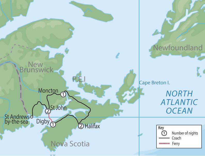 Ferry back to Nova Scotia this morning and arrive in Digby, the scallop capital of the world, where the fresh sea air and passionate Acadian culture combine to form an enchanting and historically rich town. Check into the Digby Pines Golf Resort & Spa overlooking the Annapolis Basin on the Bay of Fundy. (Breakfast is included today)